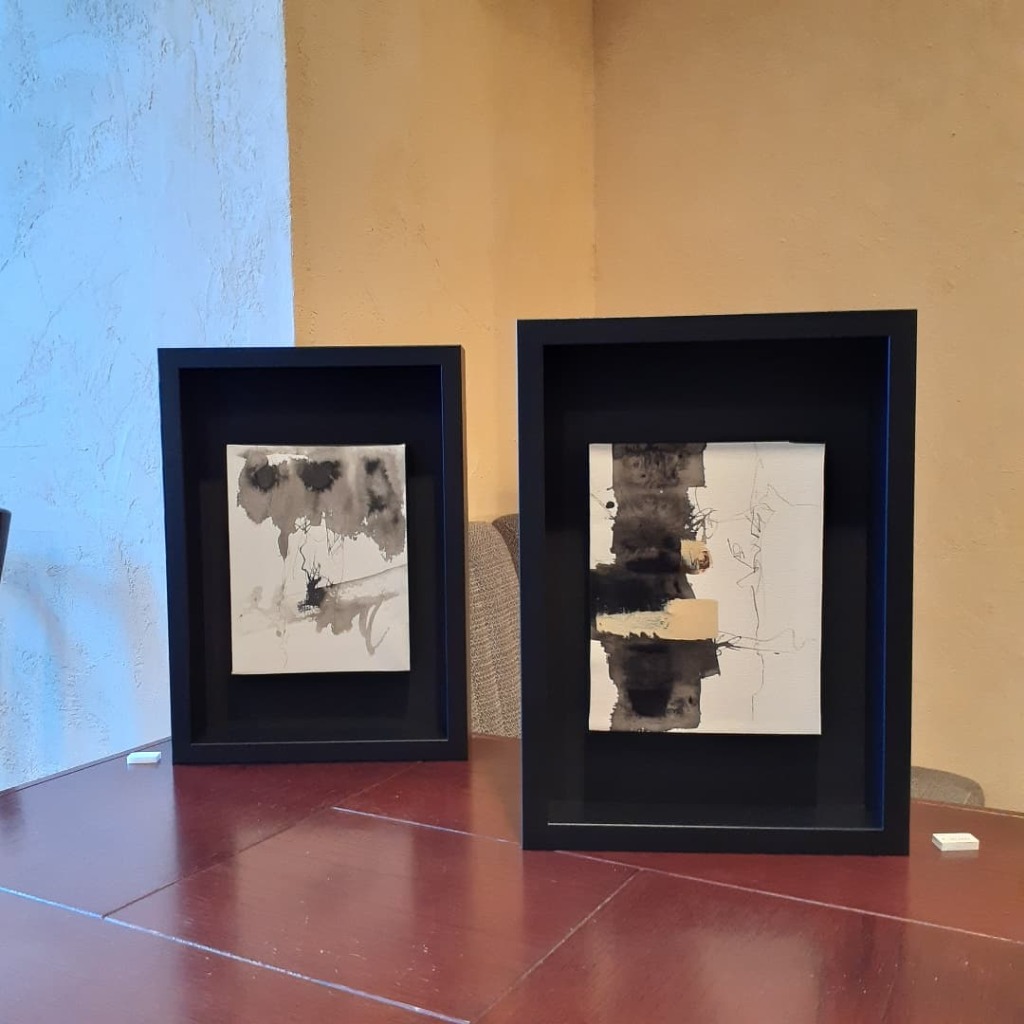 画用紙に水を張り、墨を滴し込みその後、こすったり、引っかいたりで完成です!